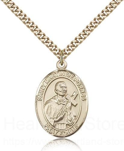 This St. Martin De Porres Pendant is made of gold filled and is approximately the size of a quarter. The jewelry pendant is paired with a 24 inch gold filled heavy curb chain as pictured. All medals are gift boxed in a beautiful blue velvet hinged jewelry gift box.