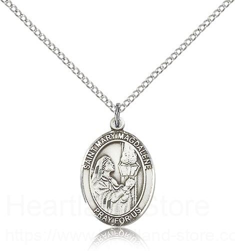 This St. Mary Magdalene Pendant is made of sterling silver and is approximately the size of a nickel. The jewelry pendant is paired with an 18 inch sterling silver light curb chain as pictured. All medals are gift boxed in a beautiful blue velvet hinged jewelry gift box.