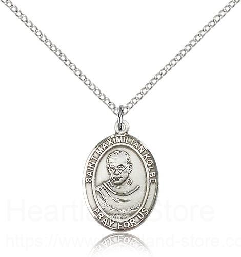 This St. Maximilian Kolbe Pendant is made of sterling silver and is approximately the size of a nickel. The jewelry pendant is paired with an 18 inch sterling silver light curb chain as pictured. All medals are gift boxed in a beautiful blue velvet hinged jewelry gift box.
