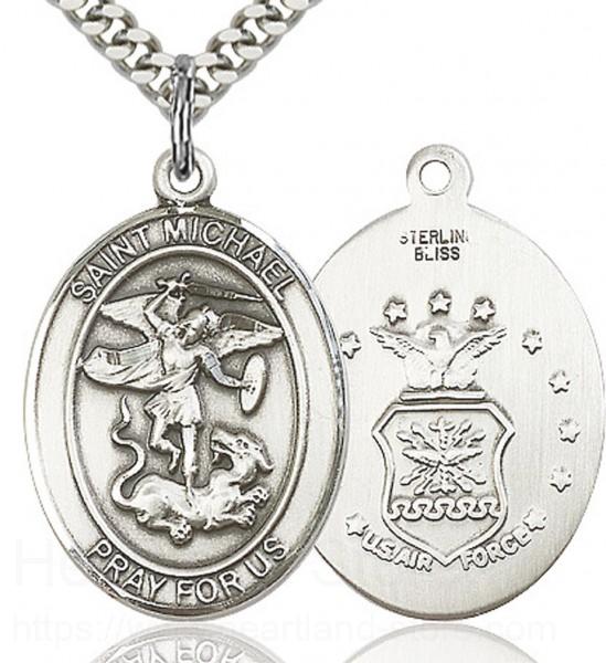 About this St. Michael Air Force Medal, Sterling Silver, Large + 24" 2.4mm Rhodium Plate Chain + Clasp