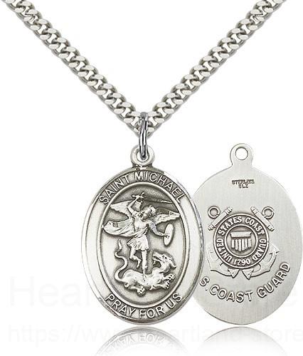 This St. Michael Coast Guard Pendant is made of sterling silver and is approximately the size of a quarter. The jewelry pendant is paired with a 24 inch stainless steel heavy curb chain as pictured. All medals are gift boxed in a beautiful blue velvet hinged jewelry gift box.