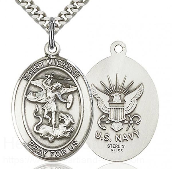 About this St. Michael Navy Medal, Sterling Silver, Large + 24" 2.4mm Rhodium Plate Chain + Clasp