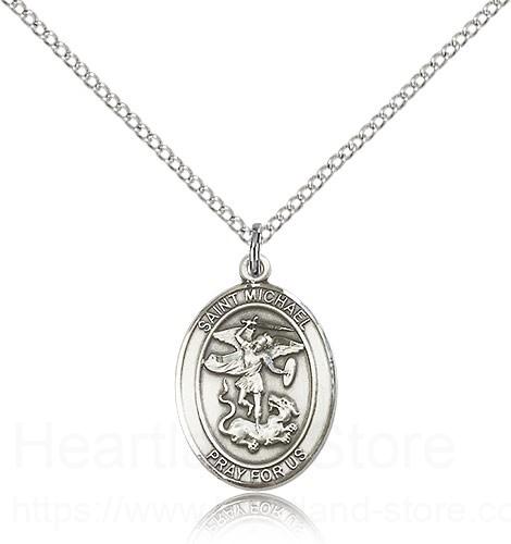 This St. Michael the Archangel Pendant is made of sterling silver and is approximately the size of a nickel. The jewelry pendant is paired with an 18 inch sterling silver light curb chain as pictured. All medals are gift boxed in a beautiful blue velvet hinged jewelry gift box.