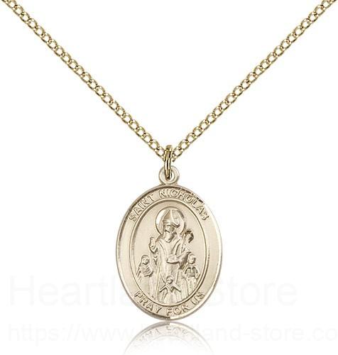 This St. Nicholas Pendant is made of gold filled and is approximately the size of a nickel. The jewelry pendant is paired with an 18 inch gold filled light curb chain as pictured. All medals are gift boxed in a beautiful blue velvet hinged jewelry gift box.