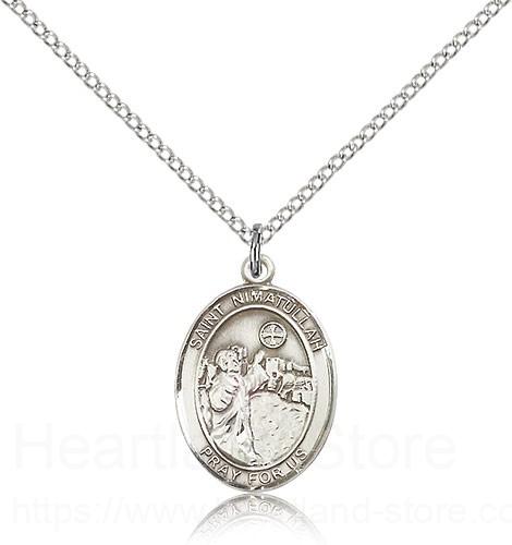 This St. Nimatullah Pendant is made of sterling silver and is approximately the size of a nickel. The jewelry pendant is paired with an 18 inch sterling silver light curb chain as pictured. All medals are gift boxed in a beautiful blue velvet hinged jewelry gift box.