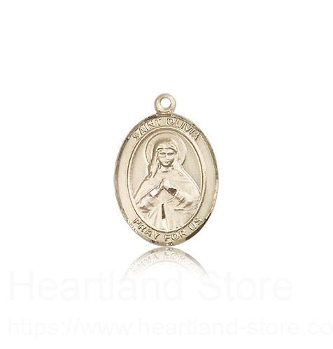 This St. Olivia Pendant is made of 14 Karat Gold and is approximately the size of a nickel. The jewelry pendant is sold individually and does not come with a chain. All medals are gift boxed in a beautiful blue velvet hinged jewelry gift box.