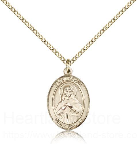 This St. Olivia Pendant is made of gold filled and is approximately the size of a nickel. The jewelry pendant is paired with an 18 inch gold filled light curb chain as pictured. All medals are gift boxed in a beautiful blue velvet hinged jewelry gift box.