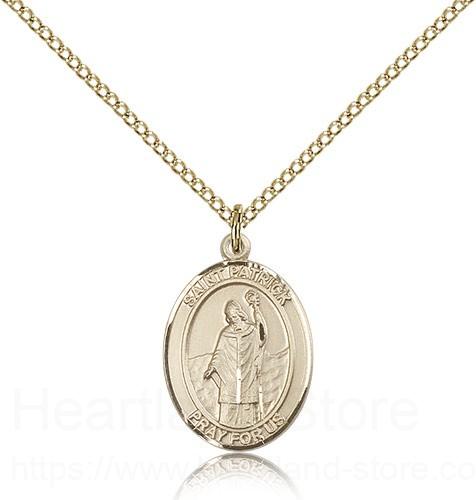 This St. Patrick Pendant is made of gold filled and is approximately the size of a nickel. The jewelry pendant is paired with an 18 inch gold filled light curb chain as pictured. All medals are gift boxed in a beautiful blue velvet hinged jewelry gift box.