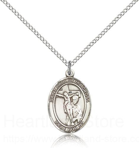St. Paul of the Cross Medal This St. Paul of the Cross Pendant is made of sterling silver and is approximately the size of a nickel. The jewelry pendant is paired with an 18 inch sterling silver light curb chain as pictured. All medals are gift boxed in a beautiful blue velvet hinged jewelry gift box.