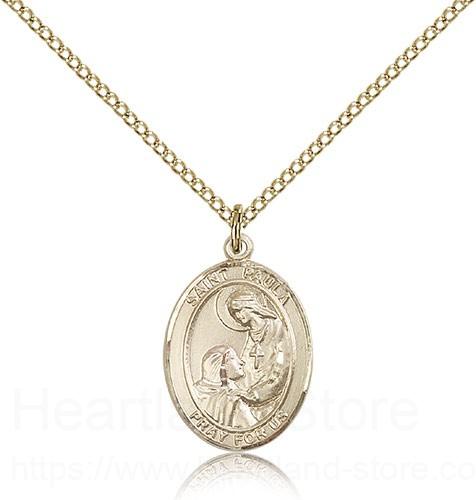 This St. Paula Pendant is made of gold filled and is approximately the size of a nickel. The jewelry pendant is paired with an 18 inch gold filled light curb chain as pictured. All medals are gift boxed in a beautiful blue velvet hinged jewelry gift box.