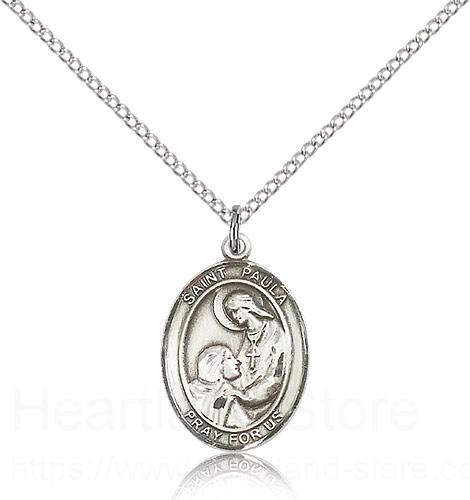 This St. Paula Pendant is made of sterling silver and is approximately the size of a nickel. The jewelry pendant is paired with an 18 inch sterling silver light curb chain as pictured. All medals are gift boxed in a beautiful blue velvet hinged jewelry gift box.