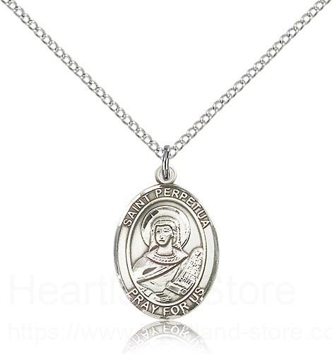 This St. Perpetua Pendant is made of sterling silver and is approximately the size of a nickel. The jewelry pendant is paired with an 18 inch sterling silver light curb chain as pictured. All medals are gift boxed in a beautiful blue velvet hinged jewelry gift box.