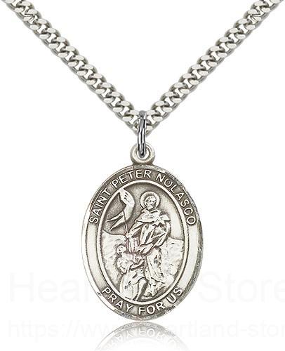 This St. Peter Nolasco Pendant is made of sterling silver and is approximately the size of a quarter. The jewelry pendant is paired with a 24 inch stainless steel heavy curb chain as pictured. All medals are gift boxed in a beautiful blue velvet hinged jewelry gift box.