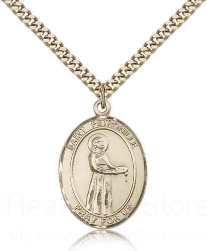 This St. Petronille Pendant is made of gold filled and is approximately the size of a quarter. The jewelry pendant is paired with a 24 inch gold filled heavy curb chain as pictured. All medals are gift boxed in a beautiful blue velvet hinged jewelry gift box.