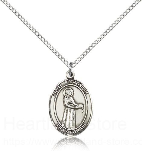 This St. Petronille Pendant is made of sterling silver and is approximately the size of a nickel. The jewelry pendant is paired with an 18 inch sterling silver light curb chain as pictured. All medals are gift boxed in a beautiful blue velvet hinged jewelry gift box.
