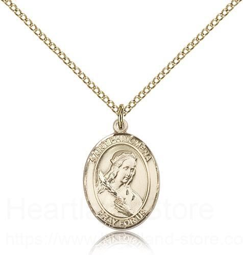 This St. Philomena Pendant is made of gold filled and is approximately the size of a nickel. The jewelry pendant is paired with an 18 inch gold filled light curb chain as pictured. All medals are gift boxed in a beautiful blue velvet hinged jewelry gift box.
