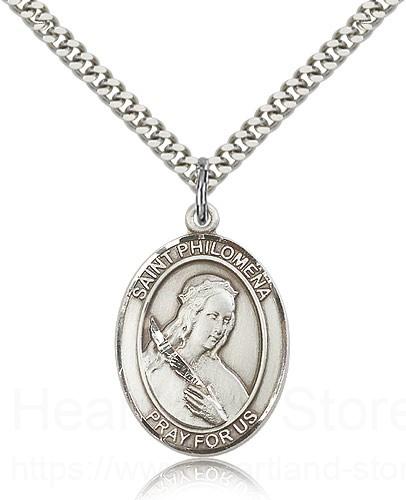 This St. Philomena Pendant is made of sterling silver and is approximately the size of a quarter. The jewelry pendant is paired with a 24 inch stainless steel heavy curb chain as pictured. All medals are gift boxed in a beautiful blue velvet hinged jewelry gift box.