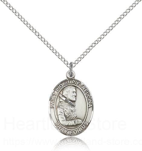This St. Pio of Pietrelcina Pendant is made of sterling silver and is approximately the size of a nickel. The jewelry pendant is paired with an 18 inch sterling silver light curb chain as pictured. All medals are gift boxed in a beautiful blue velvet hinged jewelry gift box.