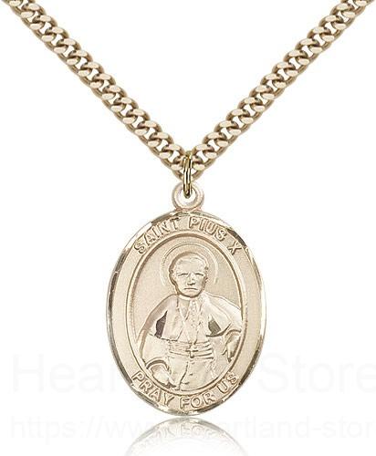 This St. Pius X Pendant is made of gold filled and is approximately the size of a quarter. The jewelry pendant is paired with a 24 inch gold filled heavy curb chain as pictured. All medals are gift boxed in a beautiful blue velvet hinged jewelry gift box.