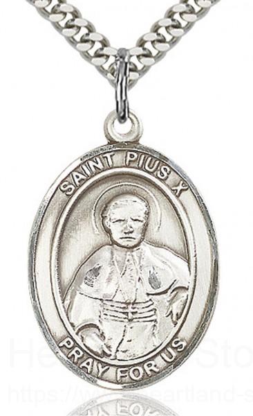 About this St. Pius X Medal, Sterling Silver, Large + 24" 2.4mm Rhodium Plate Chain + Clasp
