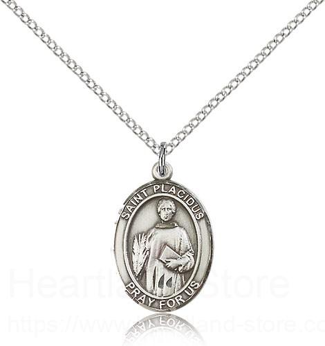 This St. Placidus Pendant is made of sterling silver and is approximately the size of a nickel. The jewelry pendant is paired with an 18 inch sterling silver light curb chain as pictured. All medals are gift boxed in a beautiful blue velvet hinged jewelry gift box.