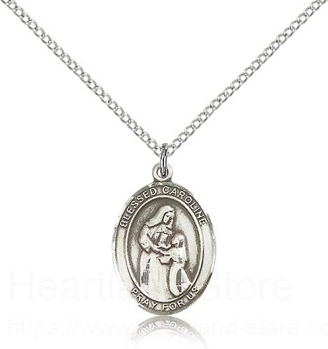 This Blessed Caroline Gerhardinger Pendant is made of sterling silver and is approximately the size of a nickel. The jewelry pendant is paired with an 18 inch sterling silver light curb chain as pictured. All medals are gift boxed in a beautiful blue velvet hinged jewelry gift box.