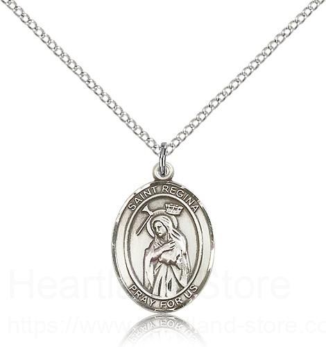 This St. Regina Pendant is made of sterling silver and is approximately the size of a nickel. The jewelry pendant is paired with an 18 inch sterling silver light curb chain as pictured. All medals are gift boxed in a beautiful blue velvet hinged jewelry gift box.