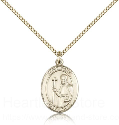 This St. Regis Pendant is made of gold filled and is approximately the size of a nickel. The jewelry pendant is paired with an 18 inch gold filled light curb chain as pictured. All medals are gift boxed in a beautiful blue velvet hinged jewelry gift box.