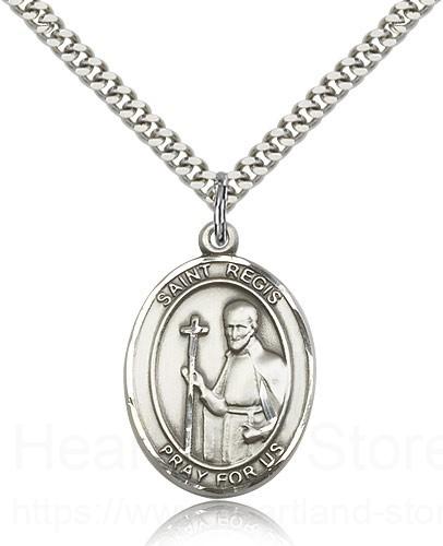 This St. Regis Pendant is made of sterling silver and is approximately the size of a quarter. The jewelry pendant is paired with a 24 inch stainless steel heavy curb chain as pictured. All medals are gift boxed in a beautiful blue velvet hinged jewelry gift box.