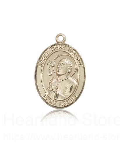 This St. Rene Goupil Pendant is made of 14 Karat Gold and is approximately the size of a quarter. The jewelry pendant is sold individually and does not come with a chain. All medals are gift boxed in a beautiful blue velvet hinged jewelry gift box.