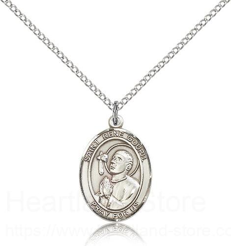 This St. Rene Goupil Pendant is made of sterling silver and is approximately the size of a nickel. The jewelry pendant is paired with an 18 inch sterling silver light curb chain as pictured. All medals are gift boxed in a beautiful blue velvet hinged jewelry gift box.