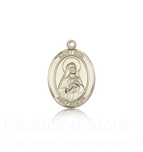 St. Rita Baseball Medal This St. Rita Baseball Pendant is made of 14 Karat Gold and is approximately the size of a nickel. The jewelry pendant is sold individually and does not come with a chain. All medals are gift boxed in a beautiful blue velvet hinged jewelry gift box.