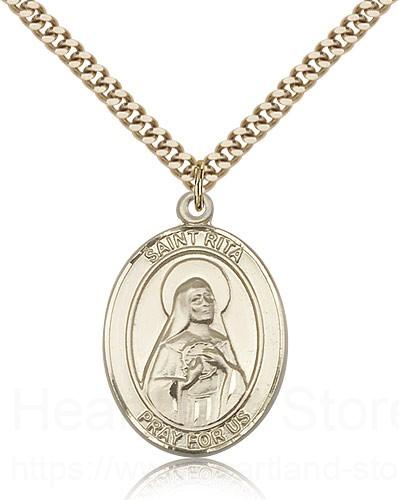 This St. Rita Baseball Pendant is made of gold filled and is approximately the size of a quarter. The jewelry pendant is paired with a 24 inch gold filled heavy curb chain as pictured. All medals are gift boxed in a beautiful blue velvet hinged jewelry gift box.