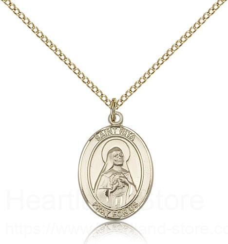 St. Rita Baseball Medal This St. Rita Baseball Pendant is made of gold filled and is approximately the size of a nickel. The jewelry pendant is paired with an 18 inch gold filled light curb chain as pictured. All medals are gift boxed in a beautiful blue velvet hinged jewelry gift box.