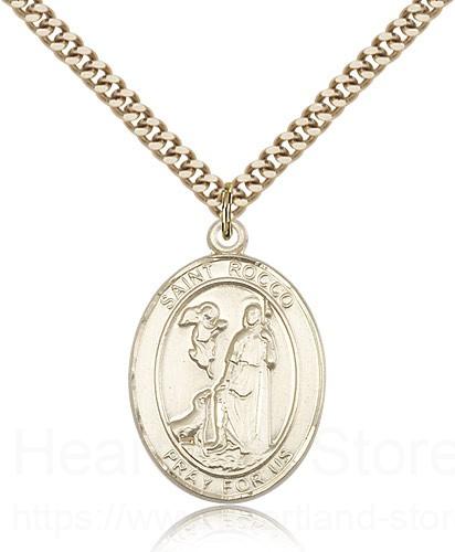 This St. Rocco Pendant is made of gold filled and is approximately the size of a quarter. The jewelry pendant is paired with a 24 inch gold filled heavy curb chain as pictured. All medals are gift boxed in a beautiful blue velvet hinged jewelry gift box.