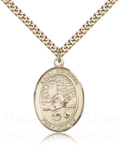 This St. Rosalia Pendant is made of gold filled and is approximately the size of a quarter. The jewelry pendant is paired with a 24 inch gold filled heavy curb chain as pictured. All medals are gift boxed in a beautiful blue velvet hinged jewelry gift box.