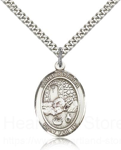 This St. Rosalia Pendant is made of sterling silver and is approximately the size of a quarter. The jewelry pendant is paired with a 24 inch stainless steel heavy curb chain as pictured. All medals are gift boxed in a beautiful blue velvet hinged jewelry gift box.