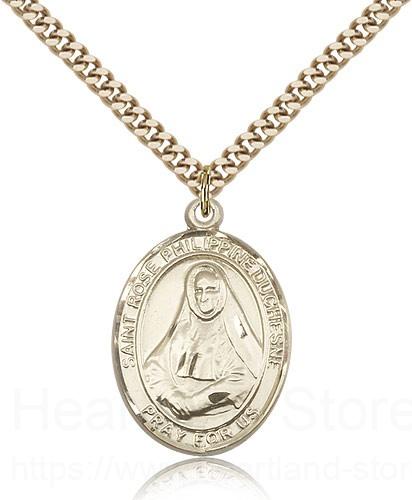 This St. Rose Philippine Pendant is made of gold filled and is approximately the size of a quarter. The jewelry pendant is paired with a 24 inch gold filled heavy curb chain as pictured. All medals are gift boxed in a beautiful blue velvet hinged jewelry gift box.