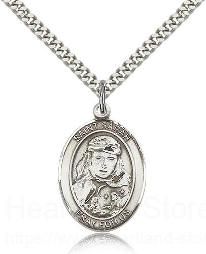 This St. Sarah Pendant is made of sterling silver and is approximately the size of a quarter. The jewelry pendant is paired with a 24 inch stainless steel heavy curb chain as pictured. All medals are gift boxed in a beautiful blue velvet hinged jewelry gift box.