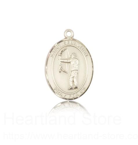 This St. Sebastian Archery Pendant is made of 14 Karat Gold and is approximately the size of a nickel. The jewelry pendant is sold individually and does not come with a chain. All medals are gift boxed in a beautiful blue velvet hinged jewelry gift box.