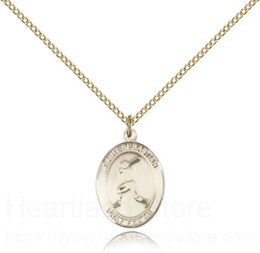 St. Sebastian Baseball Medal This St. Sebastian Baseball Pendant is made of gold filled and is approximately the size of a nickel. The jewelry pendant is paired with an 18 inch gold filled light curb chain as pictured. All medals are gift boxed in a beautiful blue velvet hinged jewelry gift box.