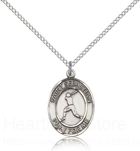 St. Sebastian Baseball Medal This St. Sebastian Baseball Pendant is made of sterling silver and is approximately the size of a nickel. The jewelry pendant is paired with an 18 inch sterling silver light curb chain as pictured. All medals are gift boxed in a beautiful blue velvet hinged jewelry gift box.