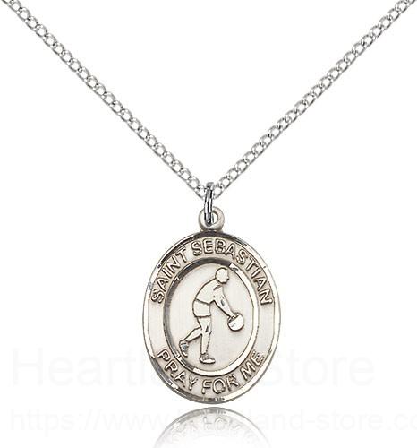 This St. Sebastian Basketball Pendant is made of sterling silver and is approximately the size of a nickel. The jewelry pendant is paired with an 18 inch sterling silver light curb chain as pictured. All medals are gift boxed in a beautiful blue velvet hinged jewelry gift box.