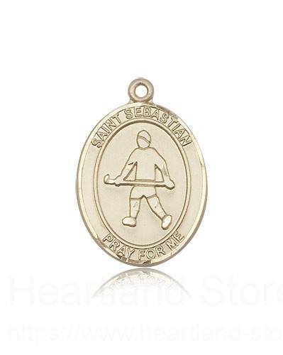 This St. Sebastian Field Hockey Pendant is made of 14 Karat Gold and is approximately the size of a quarter. The jewelry pendant is sold individually and does not come with a chain. All medals are gift boxed in a beautiful blue velvet hinged jewelry gift box.