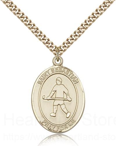 This St. Sebastian Field Hockey Pendant is made of gold filled and is approximately the size of a quarter. The jewelry pendant is paired with a 24 inch gold filled heavy curb chain as pictured. All medals are gift boxed in a beautiful blue velvet hinged jewelry gift box.