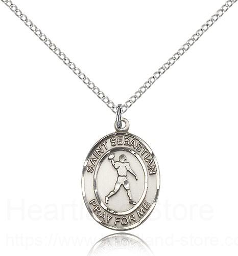 St. Sebastian Football Medal This St. Sebastian Football Pendant is made of sterling silver and is approximately the size of a nickel. The jewelry pendant is paired with an 18 inch sterling silver light curb chain as pictured. All medals are gift boxed in a beautiful blue velvet hinged jewelry gift box.