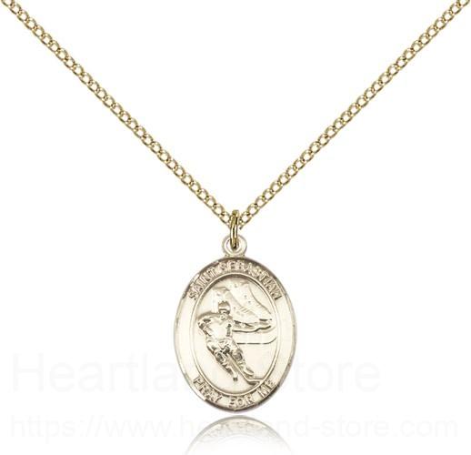 This St. Sebastian Hockey Pendant is made of gold filled and is approximately the size of a nickel. The jewelry pendant is paired with an 18 inch gold filled light curb chain as pictured. All medals are gift boxed in a beautiful blue velvet hinged jewelry gift box.