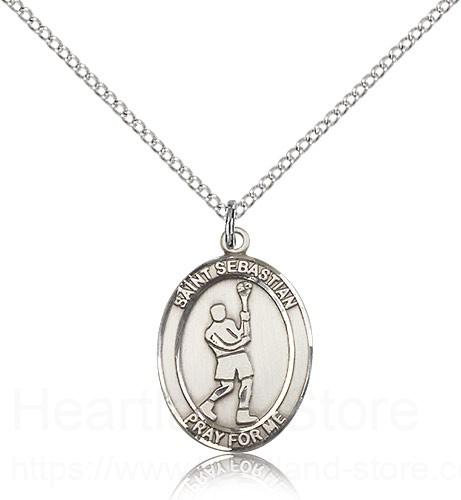 St. Sebastian Lacrosse Medal This St. Sebastian Lacrosse Pendant is made of sterling silver and is approximately the size of a dime. The jewelry pendant is paired with an 18 inch sterling silver light curb chain as pictured. All medals are gift boxed in a beautiful blue velvet hinged jewelry gift box.
