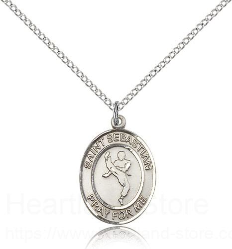 This St. Sebastian Martial Arts Pendant is made of sterling silver and is approximately the size of a nickel. The jewelry pendant is paired with an 18 inch sterling silver light curb chain as pictured. All medals are gift boxed in a beautiful blue velvet hinged jewelry gift box.