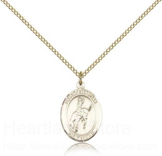 This St. Sebastian Rodeo Pendant is made of gold filled and is approximately the size of a nickel. The jewelry pendant is paired with an 18 inch gold filled light curb chain as pictured. All medals are gift boxed in a beautiful blue velvet hinged jewelry gift box.
